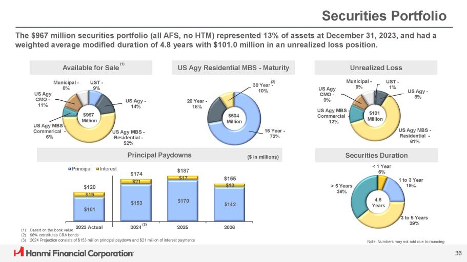ACL Analysis by Loan Type December 31, 2022 March 31, 2023 June 30, 2023 September 30, 2023 December 31, 2023 ($ in millions) Loans Allowance Loans Allowance Loans Allowance Loans Allowance Loans Allowance $ 3,833.4 $ 40.6 $ 3,784.2 $ 39.2 $ 3,738.3 $ 38.4 $ 3,773.0 $ 38.9 $ 3,889.7 $ 40.2 CRE 804.5 15.3 778.1 15.3 753.5 16.0 728.8 11.2 747.8 10.3 C&I 594.8 12.2 600.2 13.4 586.4 11.9 592.7 12.3 582.2 13.7 Equipment Finance 734.5 3.4 817.9 4.3 887.0 4.7 926.3 4.9 962.7 5.3 RRE & Consumer $ 5,967.1 $ 71.5 $ 5,980.5 $ 72.2 $ 5,965.2 $ 71.0 $ 6,020.8 $ 67.3 $ 6,182.4 $ 69.5 Total Note: Numbers may not add due to rounding 35