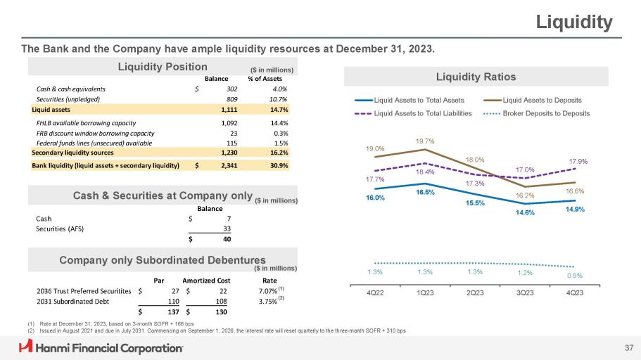 4.0% $ 302 Cash & cash equivalents Liquid Assets to Deposits Liquid Assets to Total Assets 10.7% 809 Securities (unpledged) Broker Deposits to Deposits Liquid Assets to Total Liabilities 14.7% 1,111 Liquid assets 14.4% 1,092 FHLB available borrowing capacity 0.3% 23 FRB discount window borrowing capacity 1.5% 115 Federal funds lines (unsecured) available 16.2% 1,230 Secondary liquidity sources 30.9% $ 2,341 Bank liquidity (liquid assets + secondary liquidity) Balance % of Assets Liquidity The Bank and the Company have ample liquidity resources at December 31, 2023. (1) Rate at December 31, 2023, based on 3 - month SOFR + 166 bps (2) Issued in August 2021 and due in July 2031. Commencing on September 1, 2026, the interest rate will reset quarterly to the three - month SOFR + 310 bps Liquidity Position ($ in millions) 16.0% 16.5% 15.5% 14.6% 14.9% 19.7% 19.0% 18.0% 16.2% 16.6% 17.7% 18.4% 17.3% 17.0% 17.9% 1.3% 1.3% 1.3% 1.2% 0.9% 4Q22 1Q23 2Q23 3Q23 4Q23 Liquidity Ratios 37 Par Amortized Cost 2036 Trust Preferred Securitites $ 27 $ 22 Rate 7.07% (1) (2) 3.75% 108 110 2031 Subordinated Debt $ 130 $ 137 Company only Subordinated Debentures ($ in millions) Cash & Securities at Company only ($ in millions) Balance Cash $ 7 Securities (AFS) 33 $ 40