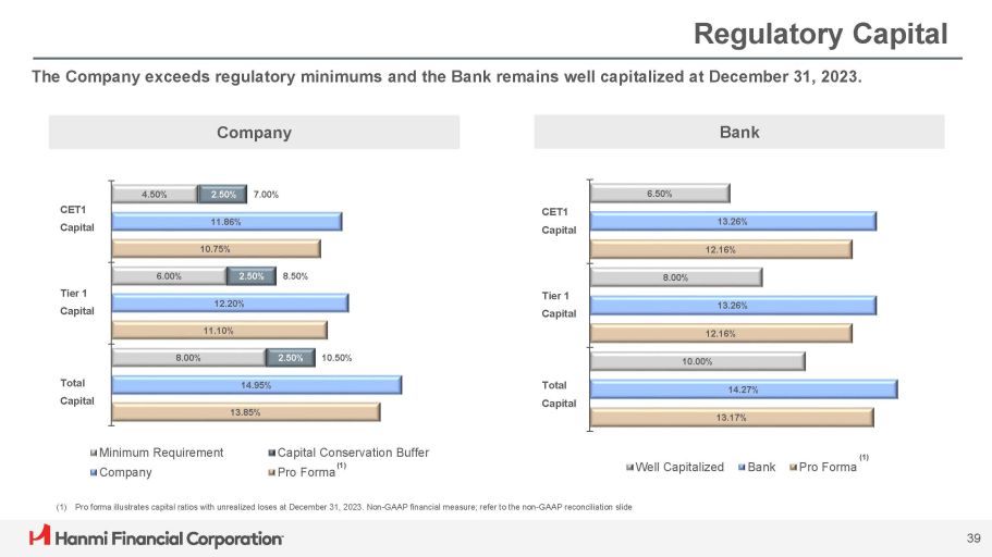(1) Non - GAAP financial measure, refer to the non - GAAP reconciliation slides (2) Rate at the end of the quarter Capital Management Tangible book value per share (TBVPS) ( 1 ) increased to $ 22 . 75 from $ 21 . 45 at the end of the prior quarter . The increase reflects a $ 27 . 3 million decrease in the unrealized after - tax loss on AFS, and $ 11 . 0 million increase in net income, net of cash dividends paid . 4.00% 3.57% 4.16% 4.61% 5 - YR 3.85% ($88.7) ($79.1) ($84.6) ($99.4) ($71.9) 4Q22 1Q23 2Q23 3Q23 4Q23 AOCI $20.54 $21.30 $21.56 $21.45 $22.75 8.50% 8.77% 8.96% 8.89% 9.14% 4Q22 1Q23 2Q23 3Q23 4Q23 (1) TBVPS TBVPS (1) & TCE/TA (1) AOCI & 5 - YR TSY TSY (2) TCE / TA ($ in millions) (1) 38