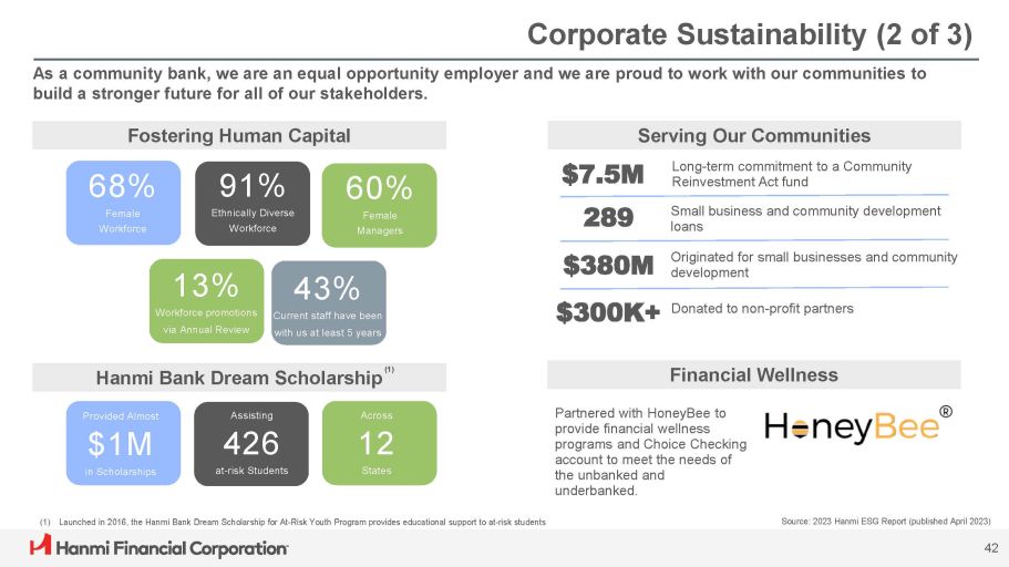 The board recognizes that sustainability broadly encompasses corporate activities that enhance the long - term value of the Company. Corporate Sustainability (1 of 3) Donated 40 solar panels to the Koreatown Senior and Community Center in Los Angeles. Source: 2023 Hanmi ESG Report (published April 2023) 41 Sustainability Enterprise Risk Management Committee (ERMC) In 2021, Hanmi Financial Corporation moved its headquarters to the Wilshire Grand Center, a LEED certified space furthering environmentally sustainable practices in Downtown Los Angeles. • The Bank’s Enterprise Risk Management Committee (ERMC) is a forum for management to engage in a collaborative discussion on the evolving risk positions of the bank, emerging risks, control gaps and mitigation strategies • The ERMC reviews ten risk pillars, including credit risk, in which management has begun discussions regarding climate risk to our loan portfolio