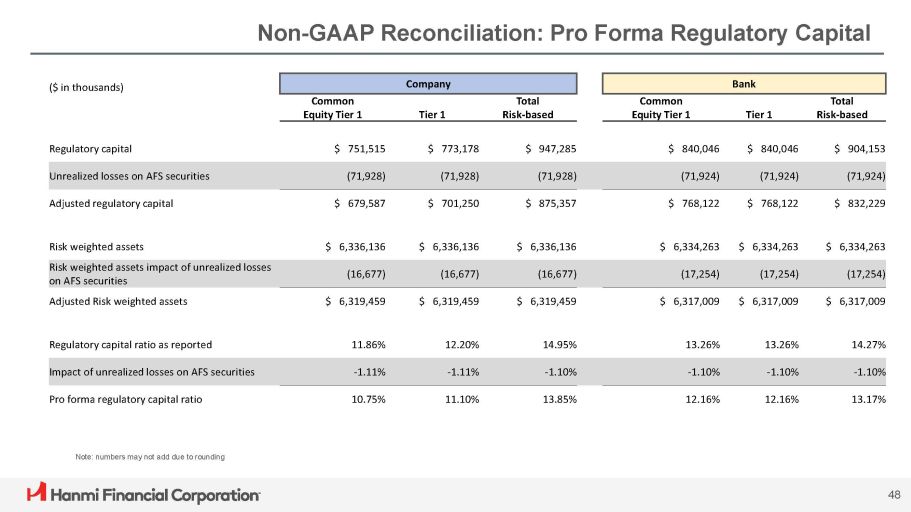 Non - GAAP Reconciliation: Tangible Common Equity to Tangible Asset Ratio 47 (1) There were no preferred shares outstanding at the periods indicated December 31, March 31, June 30, September 30, December 31, 2022 2023 2023 2023 2023 Hanmi Financial Corporation $ 7,378,262 $ 7,434,130 $ 7,344,924 $ 7,350,140 $ 7,570,341 Assets (11,225) (11,193) (11,162) (11,131) (11,099) Less goodwill and other intangible assets $ 7,367,037 $ 7,422,937 $ 7,333,762 $ 7,339,009 $ 7,559,242 Tangible assets $ 637,515 $ 662,165 $ 668,560 $ 663,359 $ 701,891 Stockholders' equity (1) (11,225) (11,193) (11,162) (11,131) (11,099) Less goodwill and other intangible assets $ 626,290 $ 650,972 $ 657,398 $ 652,228 $ 690,792 Tangible stockholders' equity (1) 8.64% 8.91% 9.10% 9.03% 9.27% Stockholders' equity to assets 8.50% 8.77% 8.96% 8.89% 9.14% Tangible common equity to tangible assets (1) 30,485,621 30,555,287 30,485,788 30,410,582 30,368,655 Common shares outstanding $ 20.54 $ 21.30 $ 21.56 $ 21.45 $ 22.75 Tangible common equity per common share ($ in thousands, except per share data)