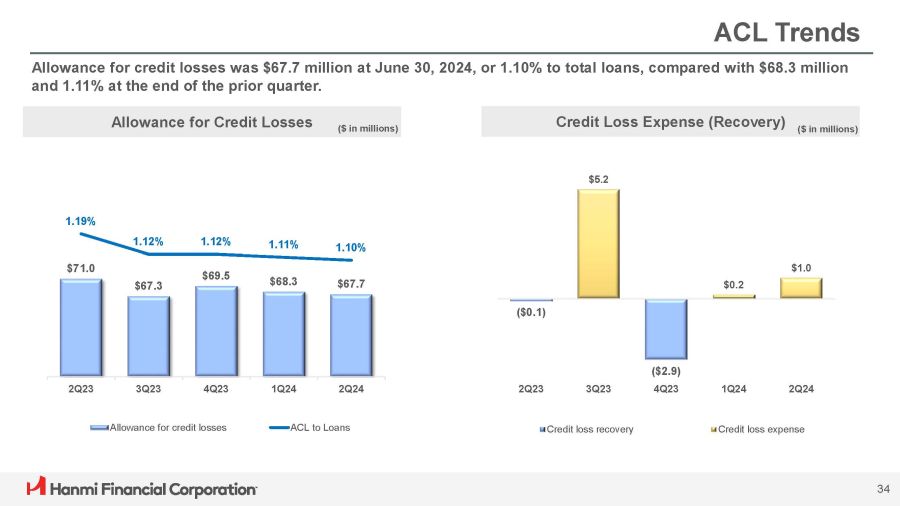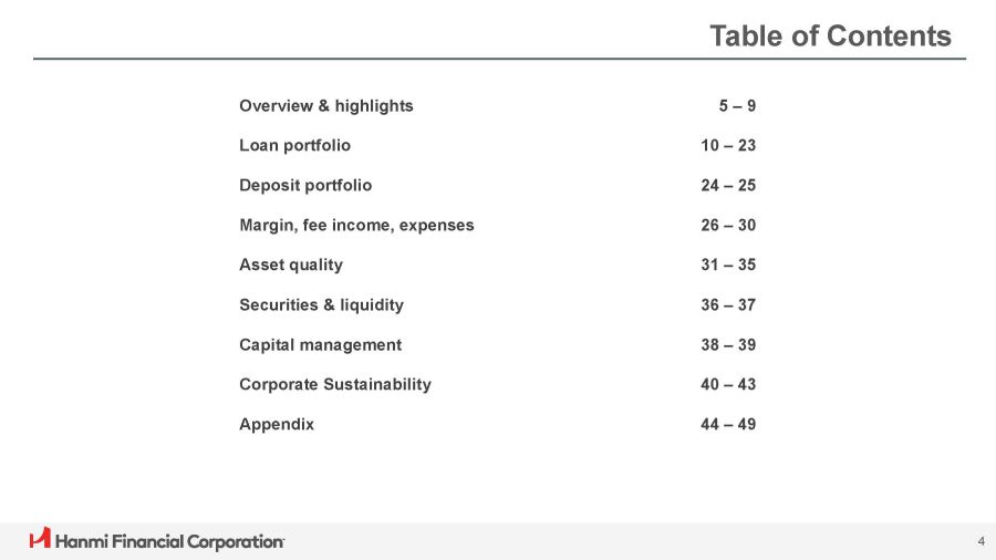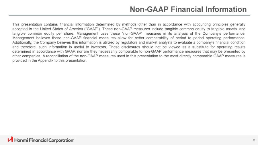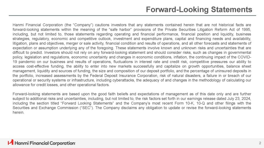 Hanmi Financial Corporation (the “Company”) cautions investors that any statements contained herein that are not historical facts are forward - looking statements within the meaning of the “safe harbor” provisions of the Private Securities Litigation Reform Act of 1995 , including, but not limited to, those statements regarding operating and financial performance, financial position and liquidity, business strategies, regulatory, economic and competitive outlook, investment and expenditure plans, capital and financing needs and availability, litigation, plans and objectives, merger or sale activity, financial condition and results of operations, and all other forecasts and statements of expectation or assumption underlying any of the foregoing . These statements involve known and unknown risks and uncertainties that are difficult to predict . Investors should not rely on any forward - looking statement and should consider risks, such as changes in governmental policy, legislation and regulations, economic uncertainty and changes in economic conditions, inflation, the continuing impact of the COVID - 19 pandemic on our business and results of operations, fluctuations in interest rate and credit risk, competitive pressures our ability to access cost - effective funding, the ability to enter into new markets successfully and capitalize on growth opportunities, balance sheet management, liquidity and sources of funding, the size and composition of our deposit portfolio, and the percentage of uninsured deposits in the portfolio, increased assessments by the Federal Deposit Insurance Corporation, risk of natural disasters, a failure in or breach of our operational or security systems or infrastructure, including cyberattacks, the adequacy of and changes in the methodology of calculating our allowance for credit losses, and other operational factors . Forward - looking statements are based upon the good faith beliefs and expectations of management as of this date only and are further subject to additional risks and uncertainties, including, but not limited to, the risk factors set forth in our earnings release dated July 23 , 2024 , including the section titled “Forward Looking Statements” and the Company’s most recent Form 10 - K, 10 - Q and other filings with the Securities and Exchange Commission (“SEC”) .. The Company disclaims any obligation to update or revise the forward - looking statements herein . 2 Forward - Looking Statements
