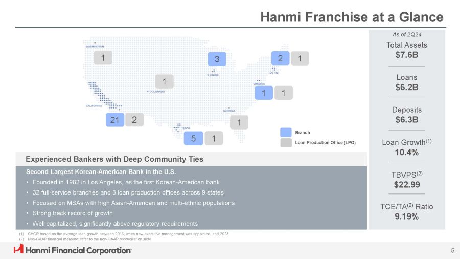 Hanmi Franchise at a Glance Loans $6.2B Deposits $6.3B TCE/TA (2) Ratio 9.19% Second Largest Korean - American Bank in the U.S. • Founded in 1982 in Los Angeles, as the first Korean - American bank • 32 full - service branches and 8 loan production offices across 9 states • Focused on MSAs with high Asian - American and multi - ethnic populations • Strong track record of growth • Well capitalized, significantly above regulatory requirements (1) CAGR based on the average loan growth between 2013, when new executive management was appointed, and 2023 (2) Non - GAAP financial measure; refer to the non - GAAP reconciliation slide Loan Growth (1) 10.4% TBVPS (2) $22.99 As of 2Q24 Total Assets $7.6B Experienced Bankers with Deep Community Ties 3 2 1 1 1 1 5 1 1 Branch Loan Production Office (LPO) 1 21 2 5