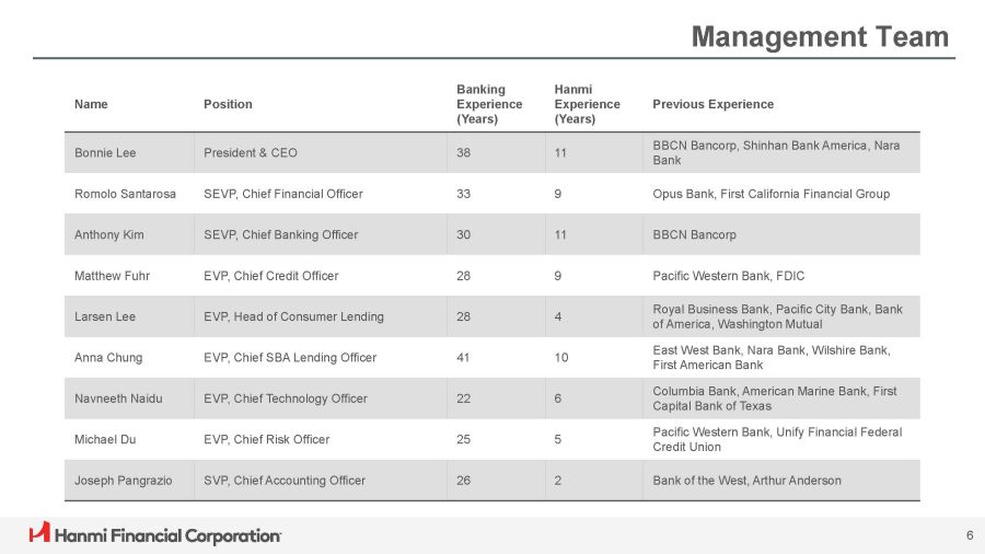 Previous Experience Hanmi Experience (Years) Banking Experience (Years) Position Name BBCN Bancorp, Shinhan Bank America, Nara Bank 11 38 President & CEO Bonnie Lee Opus Bank, First California Financial Group 9 33 SEVP, Chief Financial Officer Romolo Santarosa BBCN Bancorp 11 30 SEVP, Chief Banking Officer Anthony Kim Pacific Western Bank, FDIC 9 28 EVP, Chief Credit Officer Matthew Fuhr Royal Business Bank, Pacific City Bank, Bank of America, Washington Mutual 4 28 EVP, Head of Consumer Lending Larsen Lee East West Bank, Nara Bank, Wilshire Bank, First American Bank 10 41 EVP, Chief SBA Lending Officer Anna Chung Columbia Bank, American Marine Bank, First Capital Bank of Texas 6 22 EVP, Chief Technology Officer Navneeth Naidu Pacific Western Bank, Unify Financial Federal Credit Union 5 25 EVP, Chief Risk Officer Michael Du Bank of the West, Arthur Anderson 2 26 SVP, Chief Accounting Officer Joseph Pangrazio 6 Management Team