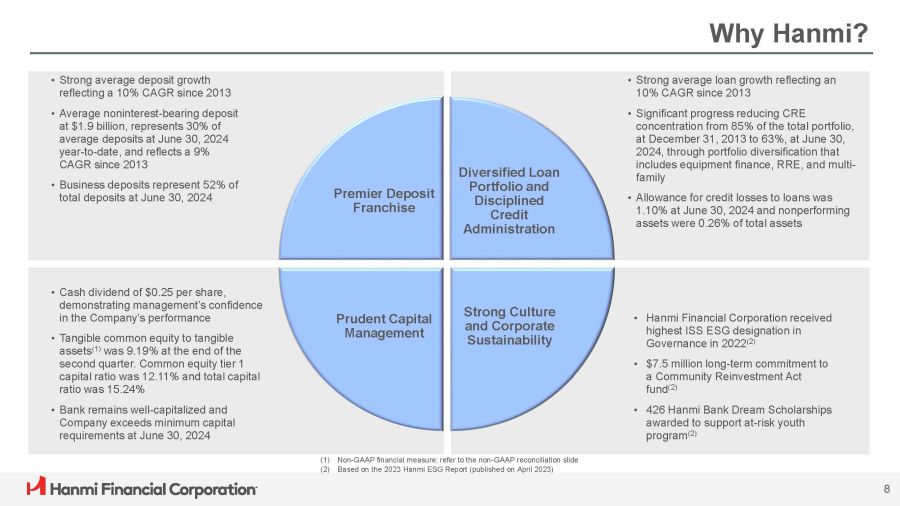 The Hanmi Timeline 1982 - First Korean American Bank in the U.S. 1988 - Began offering SBA loans - Acquired First Global Bank 2001 - Listed HAFC common stock 2004 - Acquired Pacific Union Bank ($1.2 billion in assets) 2007 - Completed $70 million secondary common stock offering 2013 - C.G. Kum appointed as the new CEO - Bonnie Lee appointed as the new COO 2014 - Acquired Central Bancorp, Inc. ($1.3 billion in assets) 2016 - Acquired Commercial Equipment Leasing Division ($228 million in assets) 2017 - Assets surpassed $5 billion - Opened a Manhattan, NY branch 2019 - Bonnie Lee appointed as the new CEO 2022 - Assets surpassed $7 billion - Celebrated 40 th Anniversary - Nasdaq Closing Bell Ceremony For over 40 years, we have been dedicated to helping our stakeholders bank on their dreams . 7 2020 - Launch of USKC (1) - Revitalization of Mortgage Lending (1) U.S. subsidiaries of Korean Corporations 2018 - Opened Chinatown branch in Houston, Texas