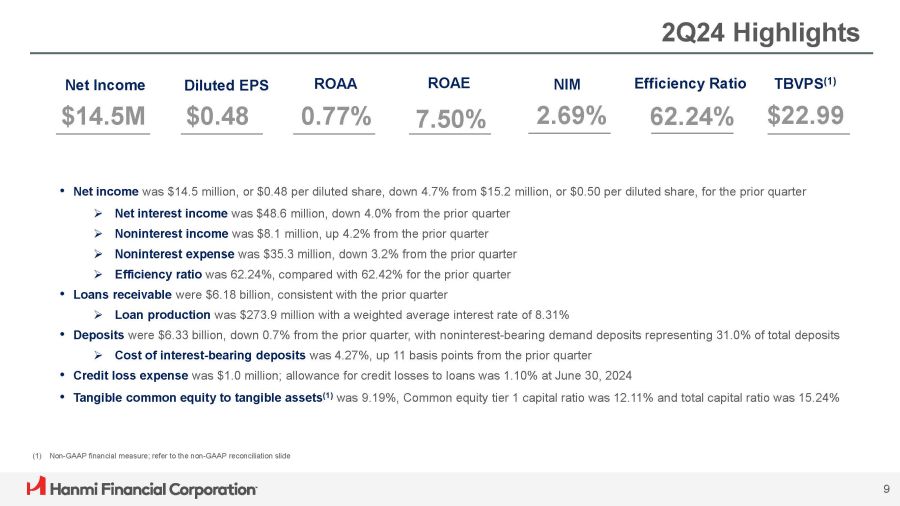Why Hanmi? • Strong average loan growth reflecting an 10% CAGR since 2013 • Significant progress reducing CRE concentration from 85% of the total portfolio, at December 31, 2013 to 63%, at June 30, 2024, through portfolio diversification that includes equipment finance, RRE, and multi - family • Allowance for credit losses to loans was 1.10% at June 30, 2024 and nonperforming assets were 0.26% of total assets • Strong average deposit growth reflecting a 10% CAGR since 2013 • Average noninterest - bearing deposit at $1.9 billion, represents 30% of average deposits at June 30, 2024 year - to - date, and reflects a 9% CAGR since 2013 • Business deposits represent 52% of total deposits at June 30, 2024 Premier Deposit Franchise Diversified Loan Portfolio and Disciplined Credit Administration 8 Strong Culture and Corporate Sustainability Prudent Capital Management • Cash dividend of $0.25 per share, demonstrating management’s confidence in the Company’s performance • Tangible common equity to tangible assets (1) was 9.19% at the end of the second quarter. Common equity tier 1 capital ratio was 12.11% and total capital ratio was 15.24% • Bank remains well - capitalized and Company exceeds minimum capital requirements at June 30, 2024 • Hanmi Financial Corporation received highest ISS ESG designation in Governance in 2022 (2) • $7.5 million long - term commitment to a Community Reinvestment Act fund (2) • 426 Hanmi Bank Dream Scholarships awarded to support at - risk youth program (2) (1) Non - GAAP financial measure; refer to the non - GAAP reconciliation slide (2) Based on the 2023 Hanmi ESG Report (published on April 2023)