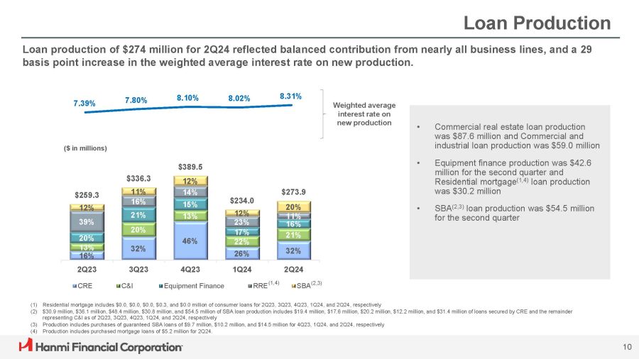 2Q24 Highlights Diluted EPS $0.48 ROAA 0.77% NIM 2.69% Efficiency Ratio 62.24% TBVPS (1) $22.99 Net Income $14.5M • Net income was $14.5 million, or $0.48 per diluted share, down 4.7% from $15.2 million, or $0.50 per diluted share, for the prior quarter » Net interest income was $48.6 million, down 4.0% from the prior quarter » Noninterest income was $8.1 million, up 4.2% from the prior quarter » Noninterest expense was $35.3 million, down 3.2% from the prior quarter » Efficiency ratio was 62.24%, compared with 62.42% for the prior quarter • Loans receivable were $6.18 billion, consistent with the prior quarter » Loan production was $273.9 million with a weighted average interest rate of 8.31% • Deposits were $6.33 billion, down 0.7% from the prior quarter, with noninterest - bearing demand deposits representing 31.0% of total deposits » Cost of interest - bearing deposits was 4.27%, up 11 basis points from the prior quarter • Credit loss expense was $1.0 million; allowance for credit losses to loans was 1.10% at June 30, 2024 • Tangible common equity to tangible assets (1) was 9.19%, Common equity tier 1 capital ratio was 12.11% and total capital ratio was 15.24% ROAE 7.50% (1) Non - GAAP financial measure; refer to the non - GAAP reconciliation slide 9