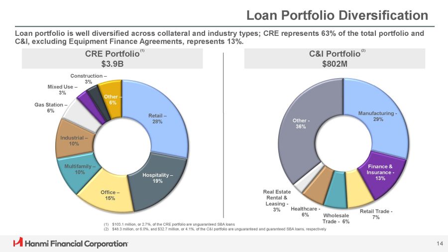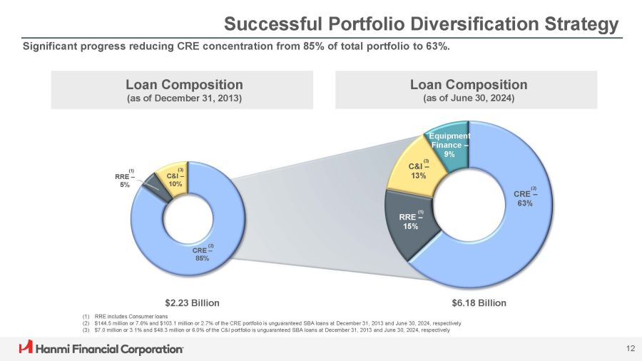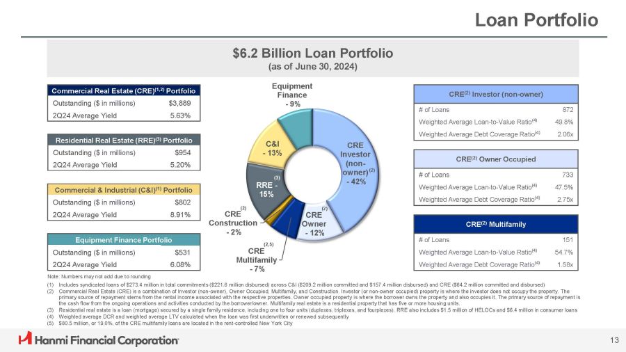 Successful Portfolio Diversification Strategy 12 Loan Composition (as of June 30, 2024) Loan Composition (as of December 31, 2013) $2.23 Billion $6.18 Billion (1) RRE includes Consumer loans (2) $144.5 million or 7.6% and $103.1 million or 2.7% of the CRE portfolio is unguaranteed SBA loans at December 31, 2013 and June 30, 2024, respectively (3) $7.0 million or 3.1% and $48.3 million or 6.0% of the C&I portfolio is unguaranteed SBA loans at December 31, 2013 and June 30, 2024, respectively RRE – 15% C&I – 13% Equipment Finance – 9% (1) RRE – 5% Significant progress reducing CRE concentration from 85% of total portfolio to 63%. (1) (2) CRE – 63% (3) (2) CRE – 85% (3) C&I – 10%