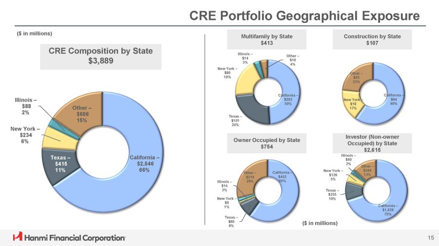 Loan Portfolio Diversification Loan portfolio is well diversified across collateral and industry types; CRE represents 63% of the total portfolio and C&I, excluding Equipment Finance Agreements, represents 13%. CRE Portfolio (1) $3.9B C&I Portfolio (2) $802M Retail – 28% Hospitality – 19% Office – 15% Multifamily – 10% Industrial – 10% Gas Station – 6% Construction – 3% Mixed Use – 3% Other – 6% Manufacturing - 29% 14 Finance & Insurance - 13% Retail Trade - 7% Wholesale Trade - 6% Healthcare - 6% Real Estate Rental & Leasing - 3% Other - 36% (1) $103.1 million, or 2.7%, of the CRE portfolio are unguaranteed SBA loans (2) $48.3 million, or 6.0%, and $32.7 million, or 4.1%, of the C&I portfolio are unguaranteed and guaranteed SBA loans, respectively