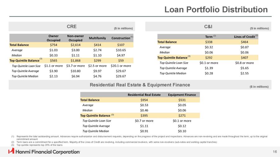 CRE Portfolio Geographical Exposure CRE Composition by State $3,889 Multifamily by State $413 Construction by State $107 Owner Occupied by State $754 Investor (Non - owner Occupied) by State $2,615 California – $2,546 66% Texas – $415 11% New York – $234 6% Illinois – $88 2% Other – $606 15% California – $202 50% Texas – $101 24% New York – $80 19% Illinois – $14 3% Other – $16 4% California – $64 60% New York – $18 17% Other – $25 23% Texas – $60 8% New York – $9 1% California – Other – $452 $219 60% 29% Illinois – $14 2% California – $1,828 70% 15 Texas – $255 10% Illinois – $60 2% New York – $126 5% Other – $346 13% ($ in millions) ($ in millions)