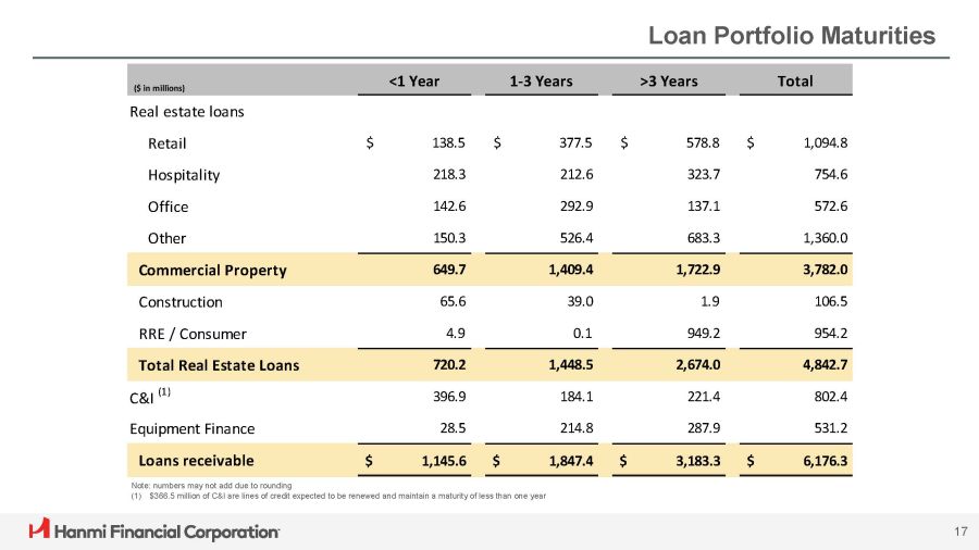 Loan Portfolio Distribution CRE C&I ($ in millions) ($ in millions) Construction (1) Multifamily Non - owner Occupied Owner Occupied $107 $414 $2,614 $754 Total Balance $10.65 $2.74 $3.00 $1.03 Average $4.97 $1.10 $1.11 $0.33 Median $59 $299 $1,868 $565 (3) Top Quintile Balance $20.1 or more $2.5 or more $3.7 or more $1.1 or more Top Quintile Loan Size $29.67 $9.97 $10.80 $3.90 Top Quintile Average $29.67 $4.76 $6.94 $2.13 Top Quintile Median Lines of Credit (2) Term (2) $464 $338 Total Balance $0.87 $0.32 Average $0.06 $0.06 Median $407 $292 Top Quintile Balance (3) $0.8 or more $0.1 or more Top Quintile Loan Size $5.65 $1.39 Top Quintile Average $2.55 $0.28 Top Quintile Median Residential Real Estate & Equipment Finance 16 Equipment Finance Residential Real Estate $531 $954 Total Balance $0.05 $0.53 Average $0.06 $0.46 Median $271 $395 Top Quintile Balance (3) $0.1 or more $0.7 or more Top Quintile Loan Size $0.12 $1.11 Top Quintile Average $0.10 $0.91 Top Quintile Median ($ in millions) (1) Represents the total outstanding amount. Advances require authorization and disbursement requests, depending on the progress of the project and inspections. Advances are non - revolving and are made throughout the term, up to the original commitment amount (2) Term loans are a commitment for a specified term. Majority of the Lines of Credit are revolving, including commercial revolvers, with some non - revolvers (sub - notes and working capital tranches) (3) Top quintile represents top 20% of the loans
