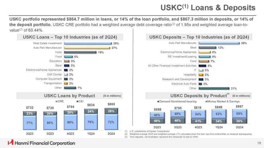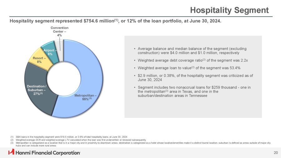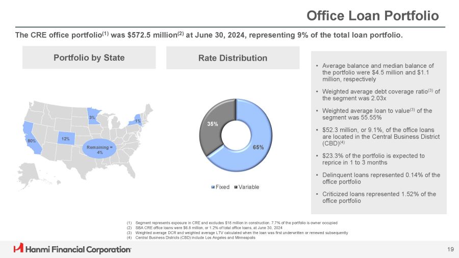 USKC (1) Loans & Deposits 28% 27% 19% 5% 3% 3% 2% 2% 2% 2% 7% Real Estate Investment Auto Part Manufacturer Hotel Food Education Steel Electronics/Home Appliances Golf Course Computer Equipment Transportation Other USKC portfolio represented $864.7 million in loans, or 14% of the loan portfolio, and $867.3 million in deposits, or 14% of the deposit portfolio. USKC CRE portfolio had a weighted average debt coverage ratio (2) of 1.95x and weighted average loan - to - value (2) of 60.44%. USKC Loans – Top 10 Industries (as of 2Q24) 72% 76% 80% 80% 77% 2Q24 1Q24 4Q23 3Q23 2Q23 USKC Loans by Product ($ in millions) $865 $834 C&I $764 CRE $720 $732 28% 24% 20% 20% 23% USKC Deposits – Top 10 Industries (as of 2Q24) 28% Auto Part Manufacurer 12% Steel 8% Electronics/Home Appliances 8% RE Investment/Leasing 7% Food 5% All Other Financial Investment Activities 3% IT 3% Hospitality 3% Research and Development 2% Electrical Auto Parts 21% Other $688 $795 $819 $848 $867 59% 62% 54% 49% 46% 36% 34% 41% 46% 49% 2Q24 1Q24 4Q23 3Q23 2Q23 Demand Noninterest - bearing Money Market & Savings USKC Deposits by Product 18 ($ in millions) (1) U.S. subsidiaries of Korean Corporations (2) Weighted average DCR and weighted average LTV calculated when the loan was first underwritten or renewed subsequently (3) Time deposits, not illustrated, represent the remainder to add to 100%. (3)
