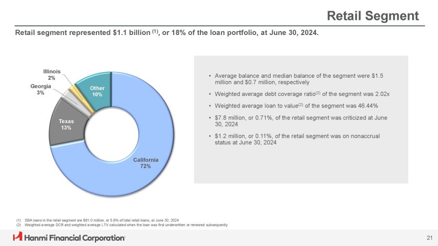 Retail Segment Retail segment represented $1.1 billion (1) , or 18% of the loan portfolio, at June 30, 2024. (1) SBA loans in the retail segment are $61.0 million, or 5.6% of total retail loans, at June 30, 2024 (2) Weighted average DCR and weighted average LTV calculated when the loan was first underwritten or renewed subsequently • Average balance and median balance of the segment were $1.5 million and $0.7 million, respectively • Weighted average debt coverage ratio (2) of the segment was 2.02x • Weighted average loan to value (2) of the segment was 46.44% • $7.8 million, or 0.71%, of the retail segment was criticized at June 30, 2024 • $1.2 million, or 0.11%, of the retail segment was on nonaccrual status at June 30, 2024 California 72% 21 Texas 13% Illinois 2% Georgia 3% Other 10%