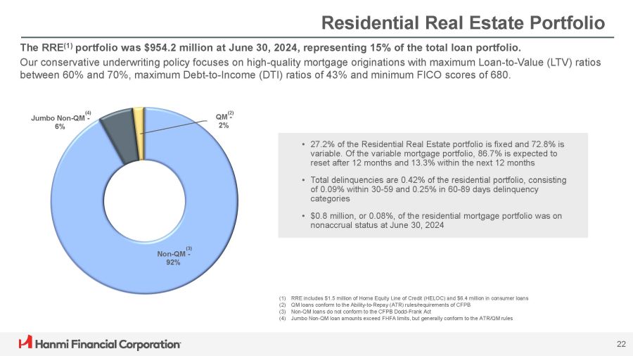 Residential Real Estate Portfolio QM - 2% 22 The RRE (1) portfolio was $954.2 million at June 30, 2024, representing 15% of the total loan portfolio. Our conservative underwriting policy focuses on high - quality mortgage originations with maximum Loan - to - Value (LTV) ratios between 60% and 70%, maximum Debt - to - Income (DTI) ratios of 43% and minimum FICO scores of 680. (1) RRE includes $1.5 million of Home Equity Line of Credit (HELOC) and $6.4 million in consumer loans (2) QM loans conform to the Ability - to - Repay (ATR) rules/requirements of CFPB (3) Non - QM loans do not conform to the CFPB Dodd - Frank Act (4) Jumbo Non - QM loan amounts exceed FHFA limits, but generally conform to the ATR/QM rules • 27.2% of the Residential Real Estate portfolio is fixed and 72.8% is variable. Of the variable mortgage portfolio, 86.7% is expected to reset after 12 months and 13.3% within the next 12 months • Total delinquencies are 0.42% of the residential portfolio, consisting of 0.09% within 30 - 59 and 0.25% in 60 - 89 days delinquency categories • $0.8 million, or 0.08%, of the residential mortgage portfolio was on nonaccrual status at June 30, 2024 (2) (3) Non - QM - 92% (4) Jumbo Non - QM - 6%