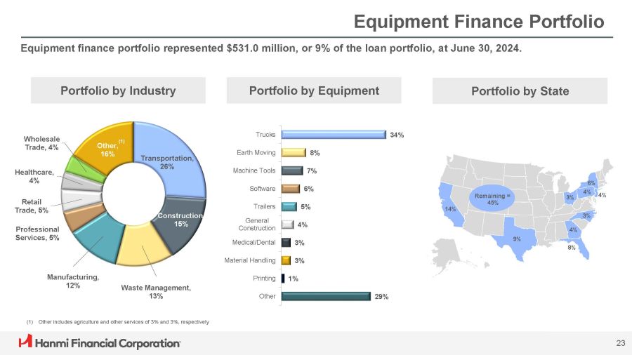 Equipment Finance Portfolio Equipment finance portfolio represented $531.0 million, or 9% of the loan portfolio, at June 30, 2024. Transportation, 26% Construction, 15% Waste Management, 13% Manufacturing, 12% Professional Services, 5% Retail Trade, 5% Healthcare, 4% Wholesale Trade, 4% Other, 16% 34% 8% 7% 6% 5% 4% 3% 3% 1% 29% Trucks Earth Moving Machine Tools Software Trailers General Construction Medical/Dental Material Handling Printing Other Portfolio by Industry Portfolio by Equipment Portfolio by State 14% 23 9% 4% 8% 6% 4% 3% 3% Remaining = 45% 4% (1) Other includes agriculture and other services of 3% and 3%, respectively (1)