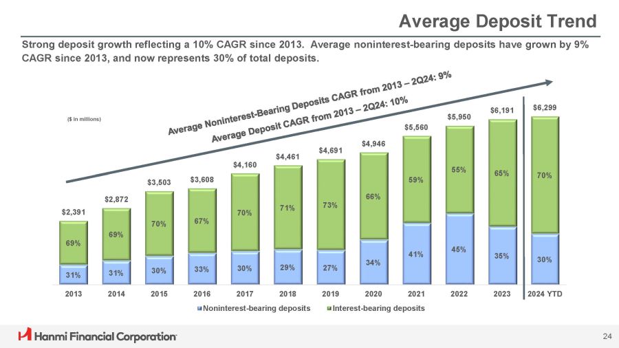 31% 31% 30% 33% 30% 29% 27% 34% 41% 45% 35% 30% 69% 69% 70% 67% 70% 71% 73% 66% 59% 55% 65% 70% $2,391 $2,872 $3,503 $3,608 $4,160 $4,461 $4,691 $5,560 $4,946 $5,950 $6,191 $6,299 2013 2014 2015 2022 2023 2024 YTD 2016 2017 2018 Noninterest - bearing deposits 2019 2020 2021 Interest - bearing deposits ($ in millions) Strong deposit growth reflecting a 10% CAGR since 2013. Average noninterest - bearing deposits have grown by 9% CAGR since 2013, and now represents 30% of total deposits. 24 Average Deposit Trend