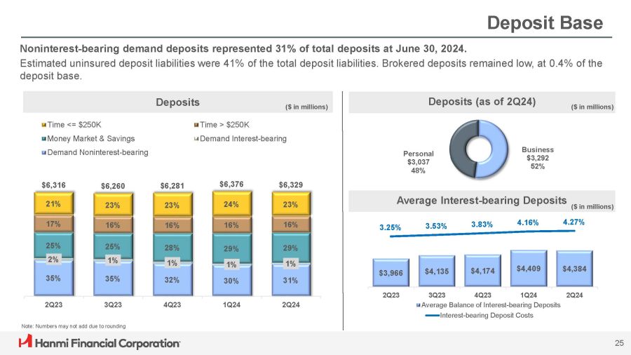 3.25% 3.53% 3.83% 4.16% 4.27% $3,966 $4,135 $4,174 $4,409 $4,384 3Q23 4Q23 1Q24 Average Balance of Interest - bearing Deposits Interest - bearing Deposit Costs 2Q23 2Q24 Deposit Base Noninterest - bearing demand deposits represented 31% of total deposits at June 30, 2024. Estimated uninsured deposit liabilities were 41% of the total deposit liabilities. Brokered deposits remained low, at 0.4% of the deposit base. Note: Numbers may not add due to rounding Deposits ($ in millions) Deposits (as of 2Q24) Average Interest - bearing Deposits ($ in millions) Business $3,292 52% Personal $3,037 48% ($ in millions) 32% 30% 31% 1% 1% 1% 25% 25% 1% 2% 35% 35% 28% 29% 29% $6,329 $6,376 $6,281 $6,260 $6,316 23% 24% 23% 23% 21% 16% 16% 16% 16% 17% 2Q23 3Q23 4Q23 1Q24 2Q24 Time <= $250K Money Market & Savings Demand Noninterest - bearing Time > $250K Demand Interest - bearing 25