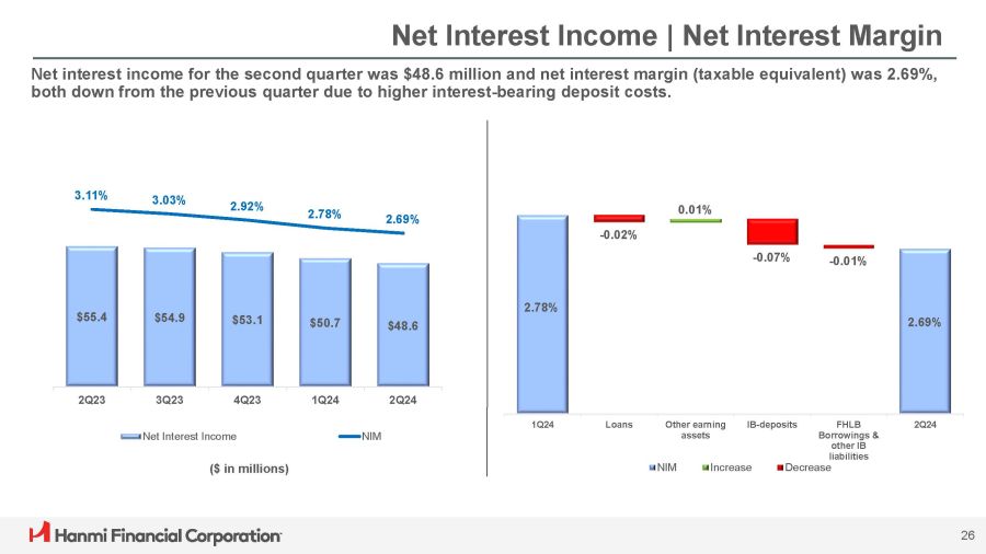 Net Interest Income | Net Interest Margin Net interest income for the second quarter was $48.6 million and net interest margin (taxable equivalent) was 2.69%, both down from the previous quarter due to higher interest - bearing deposit costs. ($ in millions) 2.78% - 0.02% 0.01% - 0.07% - 0.01% 2.69% 1Q24 Loans Other earning assets IB - deposits FHLB Borrowings & other IB liabilities Decrease 2Q24 NIM Increase $55.4 $54.9 $53.1 $50.7 $48.6 3.11% 3.03% 2.92% 2.78% 2.69% 2Q23 3Q23 4Q23 1Q24 2Q24 Net Interest Income NIM 26