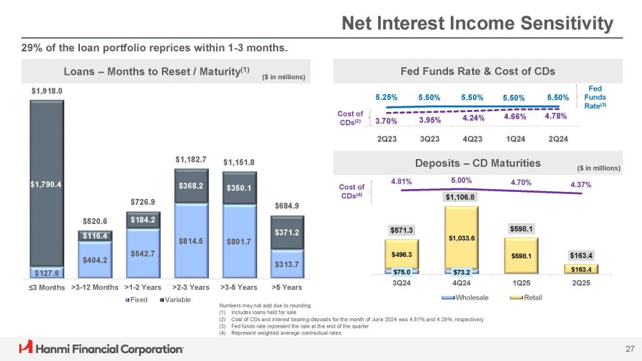 Deposits – CD Maturities Net Interest Income Sensitivity 29% of the loan portfolio reprices within 1 - 3 months. $127.6 $404.2 $542.7 $814.5 $801.7 $1,790.4 $184.2 $368.2 $350.1 $371.2 $520.6 $116.4 $1,918.0 $726.9 $1,182.7 $1,151.8 $684.9 $313.7 >3 - 5 Years >5 Years ≤3 Months >3 - 12 Months >1 - 2 Years Fixed >2 - 3 Years Variable Loans – Months to Reset / Maturity (1) ( . $ in millions) Fed Funds Rate & Cost of CDs $75.0 $73.2 $496.3 $1,033.6 $598.1 $163.4 $571.3 $1,106.8 $598.1 $163.4 4.81% 5.00% 4.70% 4.37% 3Q24 2Q25 4Q24 Wholesale 1Q25 Retail ($ in millions) Fed Funds Rate (3) 5.50% 5.50% 5.50% 5.50% 5.25% 4.78% 2Q24 4.66% 1Q24 4.24% 4Q23 3.95% 3Q23 Cost of CDs (2) 3.70% 2Q23 Cost of CDs (4) Numbers may not add due to rounding (1) Includes loans held for sale (2) Cost of CDs and interest bearing - deposits for the month of June 2024 was 4.81% and 4.28%, respectively (3) Fed funds rate represent the rate at the end of the quarter (4) Represent weighted average contractual rates 27