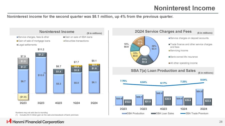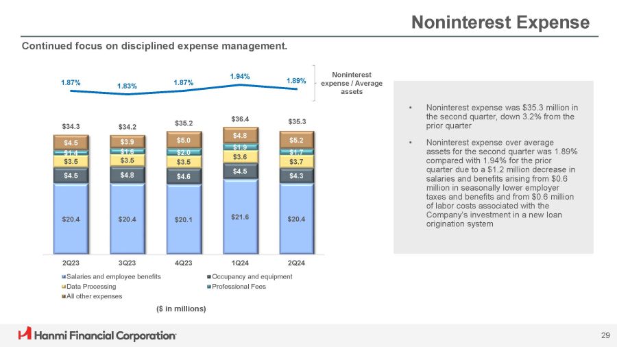 39% $2.4 21% $1.3 13% $0.8 10% $0.6 17% $1.0 Service charges on deposit accounts Trade finance and other service charges and fees Servicing income Bank - owned life insurance All other operating income Noninterest Income SBA 7(a) Loan Production and Sales ($ in millions) $30.9 $36.1 $48.4 $30.8 $54.5 $19.9 $21.0 $29.9 $25.6 $23.5 7.75% 6.84% 6.17% 7.23% 8.54% 2Q23 3Q23 4Q23 SBA Loan Sales SBA Production 1Q24 2Q24 SBA Trade Premium Noninterest income for the second quarter was $8.1 million, up 4% from the previous quarter. Noninterest Income 2Q24 Service Charges and Fees ($ in millions) ($ in millions) $6.7 $5.3 $5.8 $6.1 $1.2 $1.2 $1.4 ($1.9) $7.9 $1.9 $6.7 $7.7 $0.4 $1.5 $8.1 $0.4 $1.6 2Q23 3Q23 4Q23 1Q24 2Q24 (1) $10.0 Gain on sale of SBA loans Securities transactions Service charges, fees & other Gain of sale of mortgage loans Legal settlements $11.2 Numbers may not add due to rounding (1) Includes $4.0 million gain on the sale - and - leaseback of bank premises 28