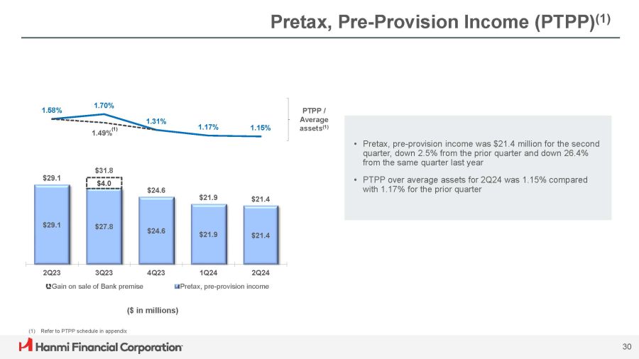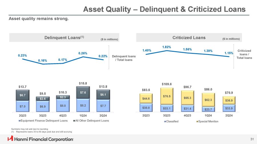 Pretax, Pre - Provision Income (PTPP) (1) • Pretax, pre - provision income was $21.4 million for the second quarter, down 2.5% from the prior quarter and down 26.4% from the same quarter last year • PTPP over average assets for 2Q24 was 1.15% compared with 1.17% for the prior quarter $29.1 $27.8 $24.6 $21.9 $21.4 $4.0 $29.1 $31.8 $24.6 $21.9 $21.4 1.58% 1.70% 1.31% 1.17% 1.15% (1) 1.49% 4Q23 2Q23 3Q23 Gain on sale of Bank premise 1Q24 2Q24 Pretax, pre - provision income PTPP / Average assets (1) 30 ($ in millions) (1) Refer to PTPP schedule in appendix