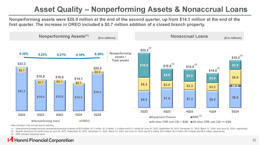Asset Quality – Delinquent & Criticized Loans Delinquent loans / Total loans $38.8 $33.1 $31.4 $23.7 $33.9 $44.6 $76.5 $65.3 $62.3 $36.9 $83.5 $109.6 $96.7 $86.0 $70.9 1.40% 1.82% 1.56% 1.39% 1.15% 2Q23 3Q23 4Q23 1Q24 2Q24 Classified Special Mention Delinquent Loans (1) Criticized Loans Criticized loans / Total loans Asset quality remains strong. $7.0 $6.9 $8.0 $8.2 $7.7 $6.7 $7.6 $6.1 $13.7 $9.5 $2.6 $10.3 $2.3 $15.8 $13.8 0.23% 0.16% 0.17% 0.26% 0.22% 2Q23 3Q23 4Q23 Equipment Finance Delinquent Loans 1Q24 2Q24 All Other Delinquent Loans ($ in millions) 31 ($ in millions) Numbers may not add due to rounding (1) Represents loans 30 to 89 days past due and still accruing