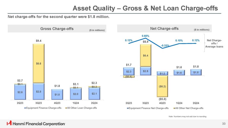 $22.2 $15.8 $15.5 $14.0 $19.2 $0.1 $0.1 $0.1 $0.1 $0.8 $22.3 $15.9 $15.6 $14.1 $20.0 1Q24 2Q24 2Q23 3Q23 4Q23 Nonperforming loans Note: Numbers may not add due to rounding OREO Asset Quality – Nonperforming Assets & Nonaccrual Loans 0.30% 0.22% 0.21% 0.19% 0.26% Nonperforming assets / Total assets Nonperforming Assets (1) Nonaccrual Loans Nonperforming assets were $20.0 million at the end of the second quarter, up from $14.1 million at the end of the first quarter. The increase in OREO included a $0.7 million addition of a closed branch property. ($ in millions) ($ in millions) (1) Nonperforming assets exclude repossessed personal property of $0.8 million, $1.3 million, $1.3 million, 1.3 million and $1.2 million for June 30, 2023, September 30, 2023, December 31, 2023, March 31, 2024, and June 30, 2024, respectively (2) Specific allowance for credit losses at June 30, 2023, September 30, 2023, December 31, 2023, March 31, 2024, and June 30, 2024 was $7.4 million, $2.9 million, $3.4 million, $5.3 million, and $6.8 million, respectively (3) RRE includes consumer loans $0.8 $5.3 $3.0 $3.3 $3.2 $5.9 $10.0 $4.9 $4.9 $3.9 $3.9 $22.2 $15.5 $14.0 $19.2 $8.6 $6.9 $7.3 $7.9 $6.9 2Q24 1Q24 4Q23 3Q23 2Q23 Equipment Finance All other CRE and C&I < $3M RRE (3) All other CRE and C&I >= $3M 32 (2) (2) (2) (2) $15.8 (2)