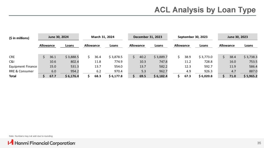 ACL Trends Allowance for credit losses was $67.7 million at June 30, 2024, or 1.10% to total loans, compared with $68.3 million and 1.11% at the end of the prior quarter. $71.0 $67.3 $69.5 $68.3 $67.7 1.19% 1.12% 1.12% 1.11% 1.10% 2Q23 3Q23 4Q23 1Q24 2Q24 Allowance for credit losses ACL to Loans ($0.1) $5.2 $0.2 $1.0 ($2.9) 4Q23 2Q23 3Q23 1Q24 2Q24 Credit loss recovery Credit loss expense Allowance for Credit Losses Credit Loss Expense (Recovery) 34 ($ in millions) ($ in millions)