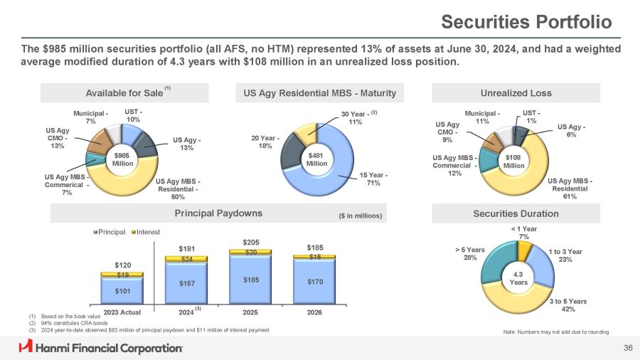 US Agy Residential MBS - Maturity 15 Year - 71% 20 Year - 18% Securities Portfolio The $985 million securities portfolio (all AFS, no HTM) represented 13% of assets at June 30, 2024, and had a weighted average modified duration of 4.3 years with $108 million in an unrealized loss position. Principal Paydowns ($ in millions) $101 $157 $185 $170 $120 $19 $181 $24 $205 $20 $185 $15 2025 2026 Principal Interest Unrealized Loss UST - 1% US Agy - 6% US Agy MBS - Residential 61% US Agy MBS - Commercial - 12% US Agy CMO - 9% Municipal - 11% Available for Sale UST - 10% US Agy - 13% US Agy MBS - Residential - 50% US Agy MBS - Commerical - 7% US Agy CMO - 13 % Municipal - 7% $985 Million Securities Duration < 1 Year 7% 1 to 3 Year 23% 3 to 5 Years 42% > 5 Years 28% 4.3 Years $481 Million 30 Year - (2) 11% $108 Million (1) Based on the book value 2023 Actual (3) 2024 year - to - date observed $63 million of principal paydown and $11 million of interest payment Note: Numbers may not add due to rounding 36 (2) 94% constitutes CRA bonds 2024 (3) (1)