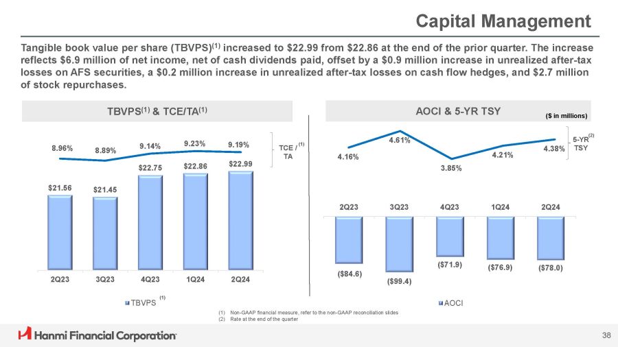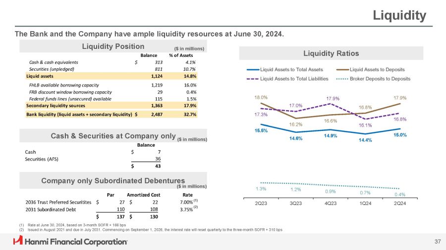 16.0% 1,219 FHLB available borrowing capacity 0.4% 29 FRB discount window borrowing capacity 1.5% 115 Federal funds lines (unsecured) available 17.9% 1,363 Secondary liquidity sources 4.1% $ 313 Cash & cash equivalents Liquid Assets to Deposits Liquid Assets to Total Assets 10.7% 811 Securities (unpledged) Broker Deposits to Deposits Liquid Assets to Total Liabilities 14.8% 1,124 Liquid assets Balance % of Assets Bank liquidity (liquid assets + secondary liquidity) $ 2,487 32.7% Liquidity The Bank and the Company have ample liquidity resources at June 30, 2024. (1) Rate at June 30, 2024, based on 3 - month SOFR + 166 bps (2) Issued in August 2021 and due in July 2031. Commencing on September 1, 2026, the interest rate will reset quarterly to the three - month SOFR + 310 bps Liquidity Position ($ in millions) 15.5% 14.6% 14.9% 14.4% 15.0% 18.0% 16.2% 16.6% 16.8% 17.9% 17.3% 17.0% 17.9% 16.1% 16.8% 1.3% 1.2% 0.9% 0.7% 0.4% 2Q23 3Q23 4Q23 1Q24 2Q24 Liquidity Ratios 37 Par Amortized Cost 2036 Trust Preferred Securitites $ 27 $ 22 Rate 7.00% (1) (2) 3.75% 108 110 2031 Subordinated Debt $ 130 $ 137 Company only Subordinated Debentures ($ in millions) Cash & Securities at Company only ($ in millions) Balance Cash $ 7 Securities (AFS) 36 $ 43