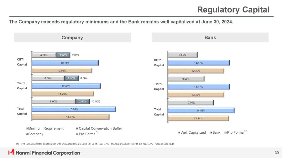 6,296,513 $ 6,296,513 $ 6,296,513 $ 6,298,921 $ 6,298,921 $ 6,298,921 Adjusted Risk weighted assets 14.51% 13.47% 13.47% 15.24% 12.46% 12.11% Regulatory capital ratio as reported - 1.17% - 1.17% - 1.17% - 1.17% - 1.18% - 1.18% Impact of unrealized losses on AFS securities 13.34% 12.30% 12.30% 14.07% 11.28% 10.93% Pro forma regulatory capital ratio Note: numbers may not add due to rounding (1) Pro forma capital ratios at June 30, 2024