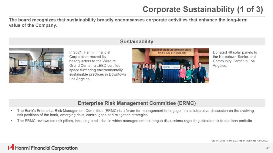The Hanmi Story & Corporate Sustainability Established in 1982 in Los Angeles, Hanmi Bank was originally founded to serve the underserved immigrant community in Koreatown. From our humble beginnings as the first Korean - American bank, Hanmi Bank has grown to embrace and support the dreams of all Americans. “Our dedication to effectively serve our customers and the communities we operate in helps us deliver attractive returns on your investment.” Bonnie Lee, President and Chief Executive Officer 2022: Hanmi Financial Corporation received highest ISS ESG designation in Governance Top: Foundations of Hanmi (1982). Bottom: New Corporate Headquarter (2021) Source: 2023 Hanmi ESG Report (published April 2023) 40 2022: Hanmi Bank recognized among the Top 10 in two categories by Bank Director #3 in $5B - $50B asset category #6 in 2022 list of Top 25 Banks