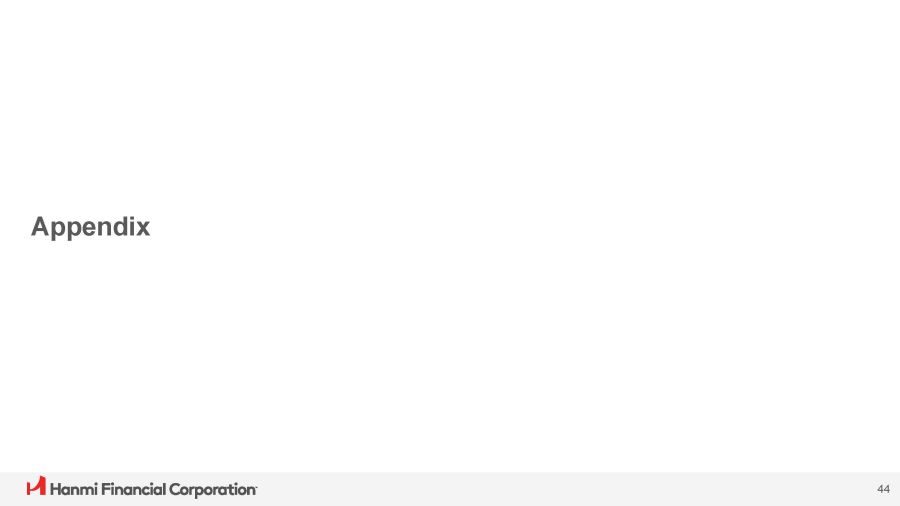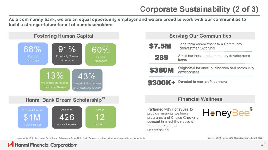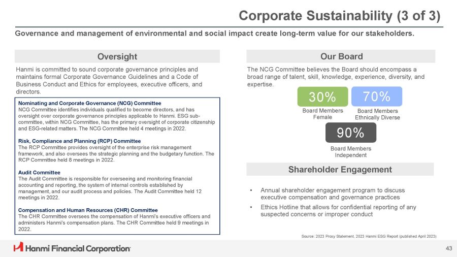As a community bank, we are an equal opportunity employer and we are proud to work with our communities to build a stronger future for all of our stakeholders. Corporate Sustainability (2 of 3) Source: 2023 Hanmi ESG Report (published April 2023) Fostering Human Capital 68% Female Workforce 91% Ethnically Diverse Workforce 60% Female Managers 43% Current staff have been with us at least 5 years 13% Workforce promotions via Annual Review Hanmi Bank Dream Scholarship Provided Almost $1M in Scholarships Assisting 426 at - risk Students Across 12 States Serving Our Communities $7.5M Long - term commitment to a Community Reinvestment Act fund 289 Small business and community development loans Financial Wellness $380M Originated for small businesses and community development $300K+ Donated to non - profit partners Partnered with HoneyBee to provide financial wellness programs and Choice Checking account to meet the needs of the unbanked and underbanked. 42 (1) (1) Launched in 2016, the Hanmi Bank Dream Scholarship for At - Risk Youth Program provides educational support to at - risk students