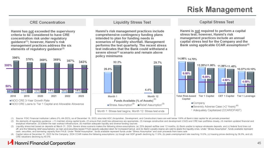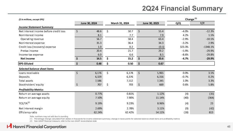 Risk Management CRE Concentration Hanmi has not exceeded the supervisory criteria to be considered to have CRE concentration risk under regulatory guidance (1) ; however, Hanmi’s risk management practices address the six elements of regulatory guidance (2) (1) Source: FDIC Financial Institution Letters (FIL - 64 - 2023), as of December 18, 2023; also total ADC (Acquisition, Development, and Construction) loans are well below 100% of Bank’s total capital for all periods presented (2) Six elements of regulatory guidance – (1) maintain strong capital levels, (2) ensure that credit loss allowances are appropriate, (3) manage construction and development (C&D) and CRE loan portfolios closely, (4) maintain updated financial and analytical information, (5) bolster the loan workout infrastructure, (6) maintain adequate liquidity and diverse funding sources (3) Liquidity stress test based on deposits at March 31, 2024. Severe stress scenario makes the following stress assumptions: (a) 25% deposit outflow over 12 months, (b) Bank unable to replace wholesale deposits, and (c) federal fund lines cut off, and the following relief assumptions: (a) loan - and - securities based FHLB capacity adjusted down for increased haircut, and (b) Bank’s assets (loans) are sold to abate the liquidity crisis. Under “Stress Assumption”, funds available represent cash, securities, and borrowing capacity from FHLB. Under “Relief Assumption”, funds available represent funds under “Stress Assumption” and cash proceeds from loans sale (4) Capital ratios at December 31, 2023 for the Company. 2024 CCAR makes the following assumptions: (a) trough real GDP growth declining by 11.6%, (b) peak unemployment rate reaching 10.0%, (c) housing prices declining by 36.0%, and (d) CRE valuations declining by 40.0% 38% 14% 13% 14% 18% 14% 396% 376% 369% 369% 357% 343% 300% 50% 2018 2019 2020 2021 2022 2023 NOO CRE 3 - Year Growth Rate NOO CRE Loans to Tier 1 Capital and Allowable Allowance Capital Stress Test Hanmi is not required to perform a capital stress test; however, Hanmi’s risk management practices include an annual capital stress test for the Company and the Bank using applicable CCAR assumptions (4) 14.95% 14.70% 12.20%11.80% 11.86% 11.40% 10.37%10.10% 8.00% 6.00% 4.50% 4.00% CET 1 Capital Tier 1 Leverage Total Risk - based Tier 1 Capital Capital Company Severely Adverse Case (+2 Years) Adequately Capitalized (CCAR/DFAST) Liquidity Stress Test Hanmi’s risk management practices include comprehensive contingency funding plans intended to plan for funding needs in scenarios of liquidity shortfall. Management performs the test quarterly. The recent stress test indicates that the Bank could withstand a severe stress (3) scenario and remain above policy minimums 25.8% 4.4% 32.2% 29.7% Month 1 Month 12 (3) Funds Available (% of Assets) Stress Assumption (3) Relief Assumption (3) 45 Month 1: Stress test begins; Month 12: Stress test ends (4)