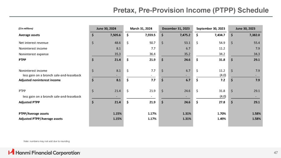 Pretax, Pre - Provision Income (PTPP) Schedule Note: numbers may not add due to rounding June 30, 2024 March 31, 2024 June 30, 2023 $ 7,559.5 7,505.6 $ December 31, 2023 $ 7,475.2 7,382.0 $ 50.7 $ 48.6 $ 8.1 7.7 September 30, 2023 $ 7,434.7 $ 53.1 $ 54.9 $ 6.7 11.2 55.4 7.9 35.3 $ 21.4 36.4 $ 21.9 35.2 $ 24.6 34.2 $ 31.8 34.3 $ 29.1 $ 8.1 $ 7.7 $ 6.7 $ 11.2 $ 7.9 - - - (4.0 ) - $ 8.1 $ 7.7 $ 6.7 $ 7.2 $ 7.9 $ 21.4 - $ 21.4 $ 21.9 - $ 21.9 $ 24.6 - $ 24.6 $ 31.8 (4.0 ) $ 27.8 $ 29.1 - $ 29.1 1.17% 1.70% ($ in millions) Average assets Net interest revenue Noninterest income Noninterest expense PTPP Noninterest income less gain on a branch sale - and - leaseback Adjusted noninterest income PTPP less gain on a branch sale - and - leaseback Adjusted PTPP PTPP/Average assets Adjusted PTPP/Average assets 1.15% 1.15% 1.17% 1.31% 1.31% 1.49% 1.58% 1.58% 47