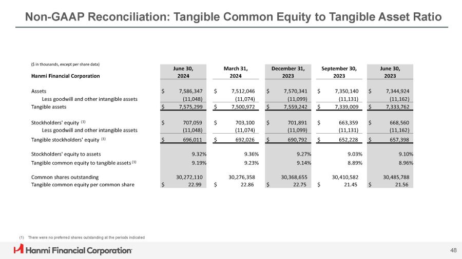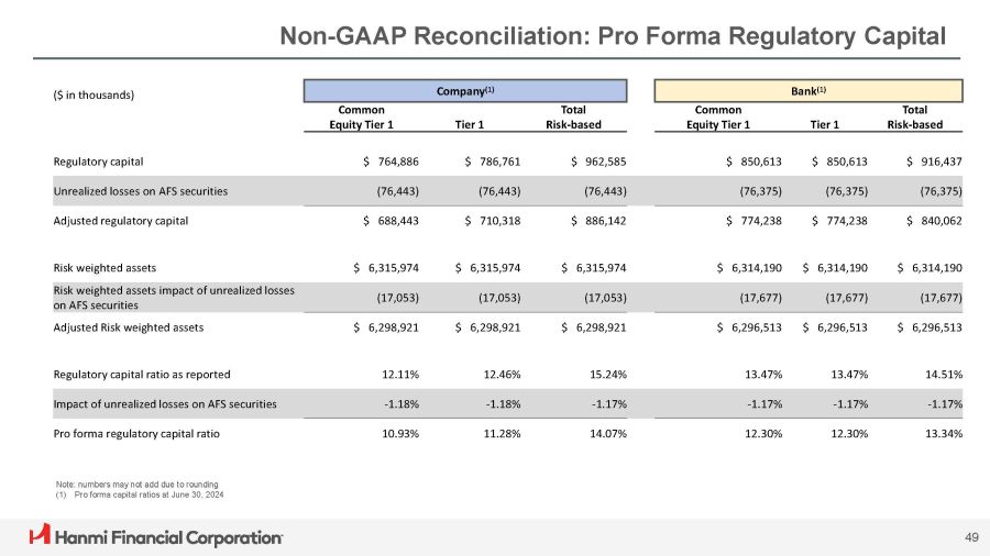 Non - GAAP Reconciliation: Tangible Common Equity to Tangible Asset Ratio 48 (1) There were no preferred shares outstanding at the periods indicated June 30, September 30, December 31, March 31, June 30, 2023 2023 2023 2024 2024 Hanmi Financial Corporation $ 7,344,924 $ 7,350,140 $ 7,570,341 $ 7,512,046 $ 7,586,347 Assets (11,162) (11,131) (11,099) (11,074) (11,048) Less goodwill and other intangible assets $ 7,333,762 $ 7,339,009 $ 7,559,242 $ 7,500,972 $ 7,575,299 Tangible assets $ 668,560 $ 663,359 $ 701,891 $ 703,100 $ 707,059 Stockholders' equity (1) (11,162) (11,131) (11,099) (11,074) (11,048) Less goodwill and other intangible assets $ 657,398 $ 652,228 $ 690,792 $ 692,026 $ 696,011 Tangible stockholders' equity (1) 9.10% 9.03% 9.27% 9.36% 9.32% Stockholders' equity to assets 8.96% 8.89% 9.14% 9.23% 9.19% Tangible common equity to tangible assets (1) 30,485,788 30,410,582 30,368,655 30,276,358 30,272,110 Common shares outstanding $ 21.56 $ 21.45 $ 22.75 $ 22.86 $ 22.99 Tangible common equity per common share ($ in thousands, except per share data)