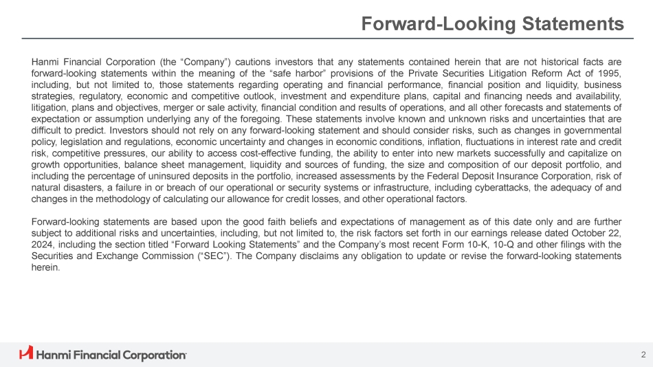 Hanmi Financial Corporation (the “Company”) cautions investors that any statements contained herein that are not historical facts are forward - looking statements within the meaning of the “safe harbor” provisions of the Private Securities Litigation Reform Act of 1995 , including, but not limited to, those statements regarding operating and financial performance, financial position and liquidity, business strategies, regulatory, economic and competitive outlook, investment and expenditure plans, capital and financing needs and availability, litigation, plans and objectives, merger or sale activity, financial condition and results of operations, and all other forecasts and statements of expectation or assumption underlying any of the foregoing . These statements involve known and unknown risks and uncertainties that are difficult to predict . Investors should not rely on any forward - looking statement and should consider risks, such as changes in governmental policy, legislation and regulations, economic uncertainty and changes in economic conditions, inflation, fluctuations in interest rate and credit risk, competitive pressures, our ability to access cost - effective funding, the ability to enter into new markets successfully and capitalize on growth opportunities, balance sheet management, liquidity and sources of funding, the size and composition of our deposit portfolio, and including the percentage of uninsured deposits in the portfolio, increased assessments by the Federal Deposit Insurance Corporation, risk of natural disasters, a failure in or breach of our operational or security systems or infrastructure, including cyberattacks, the adequacy of and changes in the methodology of calculating our allowance for credit losses, and other operational factors . Forward - looking statements are based upon the good faith beliefs and expectations of management as of this date only and are further subject to additional risks and uncertainties, including, but not limited to, the risk factors set forth in our earnings release dated October 22 , 2024 , including the section titled “Forward Looking Statements” and the Company’s most recent Form 10 - K, 10 - Q and other filings with the Securities and Exchange Commission (“SEC”) . The Company disclaims any obligation to update or revise the forward - looking statements herein . 2 Forward - Looking Statements