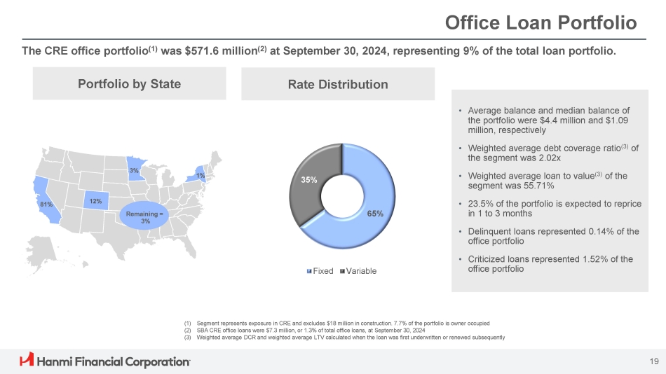 USKC (1) Loans & Deposits 26% 11% 9% 9% 8% 5% 3% 3% 3% 3% 20% Real Estate Investment Auto Part Manufacturer Hotel Food Education Steel Transportation Electronics/Home Appliances Golf Course Computer Equipment Other USKC portfolio represented $917.6 million, or 15%, of the loan portfolio, and $798.0 million, or 12%, of the deposit portfolio. USKC CRE portfolio had a weighted average debt coverage ratio (2) of 1.92x and weighted average loan - to - value (2) of 55.9%. USKC Loans – Top 10 Industries (as of 3Q24) 80% 80% 74% $720 20% $764 20% $918 26% C&I $865 CRE (4) $834 28% 24% 72% 76% 3Q23 4Q23 1Q24 2Q24 3Q24 USKC Loans by Product ($ in millions) USKC Deposits – Top 10 Industries (as of 3Q24) 27% Auto Part Manufacurer 26% Steel 21% Electronics/Home Appliances 5% RE Investment/Leasing 3% Food 3% All Other Financial Investment Activities 2% IT 2% Hospitality 2% Research and Development 2% Electrical Auto Parts 7% Other 41% 34% 36% 54% 62% 59% $795 49% 46% $819 $848 $867 $798 54% 41% 3Q23 4Q23 1Q24 2Q24 3Q24 Demand Noninterest - bearing Money Market & Savings 18 USKC Deposits by Product (3) ($ in millions) (1) U.S. subsidiaries of Korean Corporations (2) Weighted average DCR and weighted average LTV calculated when the loan was first underwritten or renewed subsequently (3) Time deposits, not illustrated, represent the remainder to add to 100%. (4) Criticized loans represent 11.96% of the USKC loan portfolio stemming from two special mention loans of $109.7 million in the hospitality industry