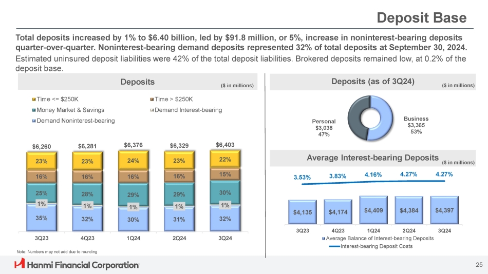 3.53% 3.83% 4.16% 4.27% 4.27% $4,135 $4,174 $4,409 $4,384 $4,397 4Q23 1Q24 2Q24 Average Balance of Interest - bearing Deposits Interest - bearing Deposit Costs 3Q23 3Q24 Deposit Base Total deposits increased by 1% to $6.40 billion, led by $91.8 million, or 5%, increase in noninterest - bearing deposits quarter - over - quarter. Noninterest - bearing demand deposits represented 32% of total deposits at September 30, 2024. Estimated uninsured deposit liabilities were 42% of the total deposit liabilities. Brokered deposits remained low, at 0.2% of the deposit base. 3Q23 4Q23 Note: Numbers may not add due to rounding Deposits Deposits (as of 3Q24) ($ in millions) ($ in millions) Average Interest - bearing Deposits Business $3,365 53% Personal $3,038 47% ($ in millions) 35% 32% 30% 31% 32% 1% 1% 1% 1% 1% 25% 28% 29% 29% 30% 16% 16% 16% 16% 15% 23% 23% 24% 23% 22% $6,260 $6,281 $6,376 $6,329 $6,403 1Q24 2Q24 3Q24 Time <= $250K Money Market & Savings Demand Noninterest - bearing Time > $250K Demand Interest - bearing 25