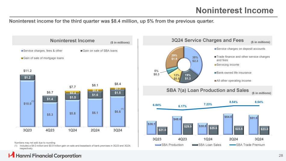 Net Interest Income Sensitivity Loan & Deposit Beta (1) . Fed Funds Rate & Cost of CDs $73.2 $60.0 $1,020.9 $677.2 $441.3 $89.8 $1,094.1 $737.2 $441.3 $89.8 5.01% 4.73% 4.40% 3.54% 4Q24 3Q25 1Q25 Wholesale 2Q25 Retail ($ in millions) 4Q23 1Q24 2Q24 Deposits – CD Maturities 5.50% 5.50% 5.50% 5.50% 5.00% 3.95% 4.24% 4.66% 4.78% 4.79% 3Q23 3Q24 Fed Funds Rate (3) Cost of CDs (2) ($ in millions) Cost of CDs (4) Numbers may not add due to rounding (1) Loan yield and cost of interest - bearing deposit represent monthly yield and cost respectively. Fed funds rate represents the rate at the end of the month. Beta is measured between March 2022 and June 2024 (2) Cost of CDs and interest bearing - deposits for the month of September 2024 was 4.77% and 4.22%, respectively (3) Fed funds rate represents the rate at the end of the quarter (4) Represent weighted average contractual rates 4.24% 4.14% 4.49% 4.79% 5.44% 5.60% 5.64% 5.78% 5.91% 6.02% 6.00% 0.27% 0.25% 0.40% 0.99% 2.08% 2.97% 3.37% 3.60% 3.97% 4.20% 4.28% 0.2 5 % 0.50% 1.75% 3.25% 4.50% 5.00% 5.25% 5.50% 5.50% 5.50% 5.50% Fed Funds Rate 27 Loan Yield Interest - bearing deposit cost Loan Beta: 37% Deposit Beta: 80%