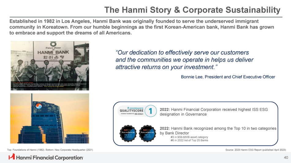 The Hanmi Story & Corporate Sustainability Established in 1982 in Los Angeles, Hanmi Bank was originally founded to serve the underserved immigrant community in Koreatown. From our humble beginnings as the first Korean - American bank, Hanmi Bank has grown to embrace and support the dreams of all Americans. “Our dedication to effectively serve our customers and the communities we operate in helps us deliver attractive returns on your investment.” Bonnie Lee, President and Chief Executive Officer 2022: Hanmi Financial Corporation received highest ISS ESG designation in Governance Top: Foundations of Hanmi (1982). Bottom: New Corporate Headquarter (2021) Source: 2023 Hanmi ESG Report (published April 2023) 40 2022: Hanmi Bank recognized among the Top 10 in two categories by Bank Director #3 in $5B - $50B asset category #6 in 2022 list of Top 25 Banks