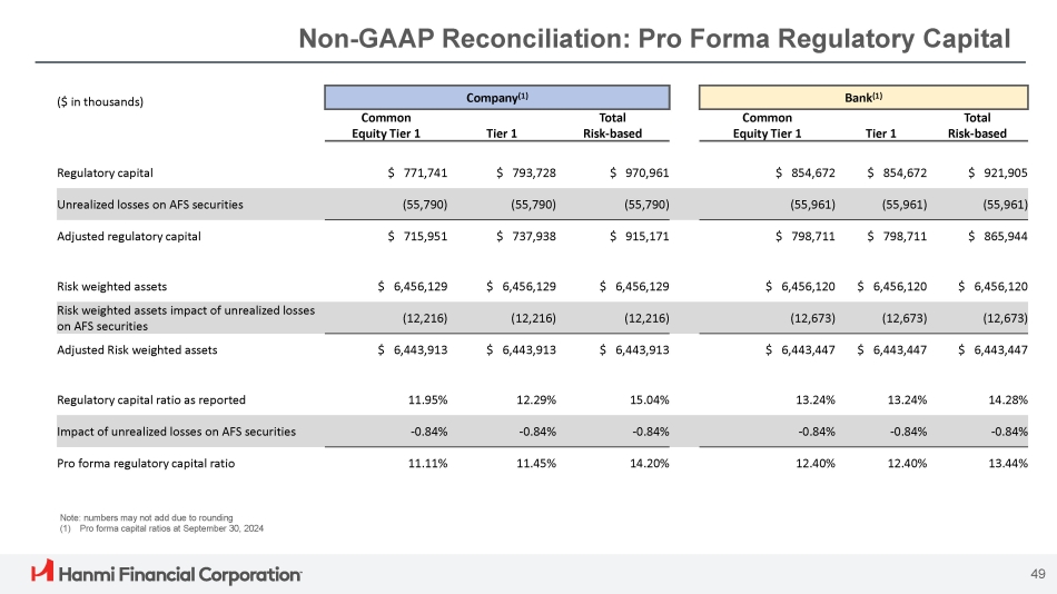 Non - GAAP Reconciliation: Tangible Common Equity to Tangible Asset Ratio 48 (1) There were no preferred shares outstanding at the periods indicated September 30, December 31, March 31, June 30, September 30, ($ in thousands, except per share data) 2023 2023 2024 2024 2024 Hanmi Financial Corporation $ 7,350,140 $ 7,570,341 $ 7,512,046 $ 7,586,347 $ 7,712,299 Assets (11,131) (11,099) (11,074) (11,048) (11,031) Less goodwill and other intangible assets $ 7,339,009 $ 7,559,242 $ 7,500,972 $ 7,575,299 $ 7,701,268 Tangible assets $ 663,359 $ 701,891 $ 703,100 $ 707,059 $ 736,709 Stockholders' equity (1) (11,131) (11,099) (11,074) (11,048) (11,031) Less goodwill and other intangible assets $ 652,228 $ 690,792 $ 692,026 $ 696,011 $ 725,678 Tangible stockholders' equity (1) 9.03% 9.27% 9.36% 9.32% 9.55% Stockholders' equity to assets 8.89% 9.14% 9.23% 9.19% 9.42% Tangible common equity to tangible assets (1) 30,410,582 30,368,655 30,276,358 30,272,110 30,196,755 Common shares outstanding $ 21.45 $ 22.75 $ 22.86 $ 22.99 $ 24.03 Tangible common equity per common share