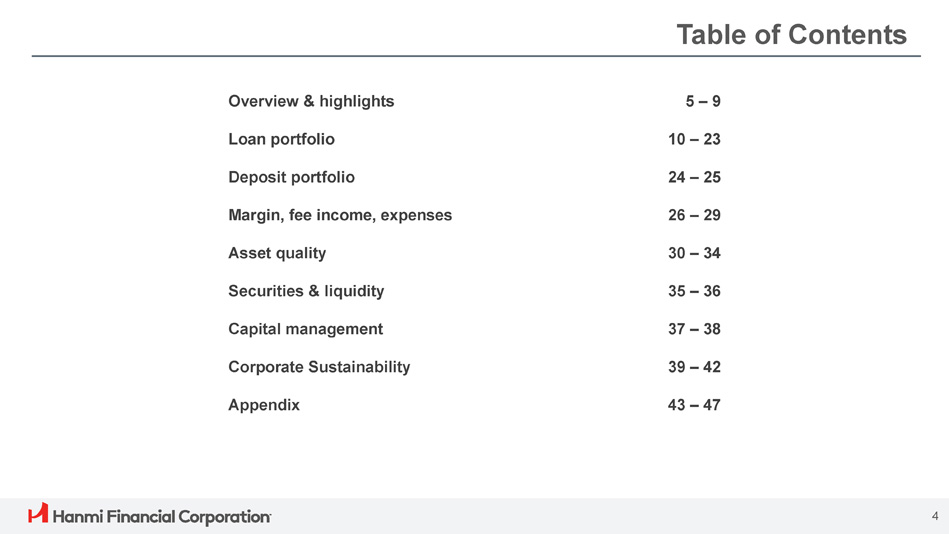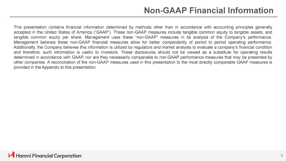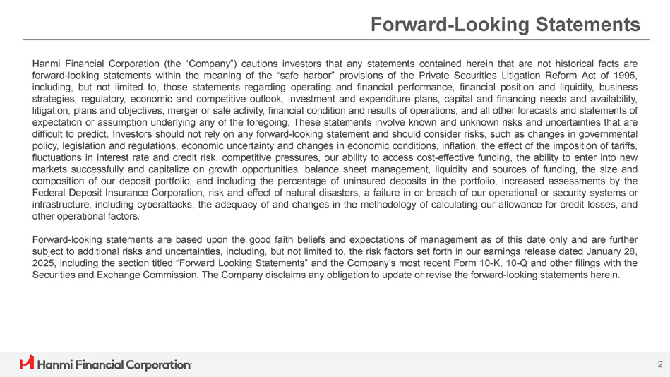 Hanmi Financial Corporation (the “Company”) cautions investors that any statements contained herein that are not historical facts are forward - looking statements within the meaning of the “safe harbor” provisions of the Private Securities Litigation Reform Act of 1995 , including, but not limited to, those statements regarding operating and financial performance, financial position and liquidity, business strategies, regulatory, economic and competitive outlook, investment and expenditure plans, capital and financing needs and availability, litigation, plans and objectives, merger or sale activity, financial condition and results of operations, and all other forecasts and statements of expectation or assumption underlying any of the foregoing . These statements involve known and unknown risks and uncertainties that are difficult to predict . Investors should not rely on any forward - looking statement and should consider risks, such as changes in governmental policy, legislation and regulations, economic uncertainty and changes in economic conditions, inflation, the effect of the imposition of tariffs, fluctuations in interest rate and credit risk, competitive pressures, our ability to access cost - effective funding, the ability to enter into new markets successfully and capitalize on growth opportunities, balance sheet management, liquidity and sources of funding, the size and composition of our deposit portfolio, and including the percentage of uninsured deposits in the portfolio, increased assessments by the Federal Deposit Insurance Corporation, risk and effect of natural disasters, a failure in or breach of our operational or security systems or infrastructure, including cyberattacks, the adequacy of and changes in the methodology of calculating our allowance for credit losses, and other operational factors . Forward - looking statements are based upon the good faith beliefs and expectations of management as of this date only and are further subject to additional risks and uncertainties, including, but not limited to, the risk factors set forth in our earnings release dated January 28 , 2025 , including the section titled “Forward Looking Statements” and the Company’s most recent Form 10 - K, 10 - Q and other filings with the Securities and Exchange Commission . The Company disclaims any obligation to update or revise the forward - looking statements herein . 2 Forward - Looking Statements