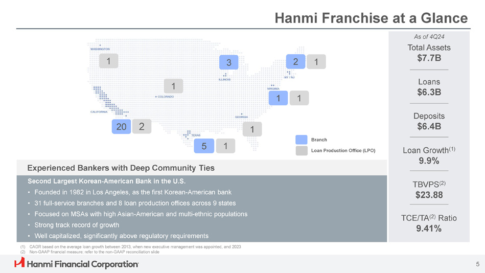 Hanmi Franchise at a Glance Loans $6.3B Deposits $6.4B TCE/TA (2) Ratio 9.41% Second Largest Korean - American Bank in the U.S. • Founded in 1982 in Los Angeles, as the first Korean - American bank • 31 full - service branches and 8 loan production offices across 9 states • Focused on MSAs with high Asian - American and multi - ethnic populations • Strong track record of growth • Well capitalized, significantly above regulatory requirements (1) CAGR based on the average loan growth between 2013, when new executive management was appointed, and 2023 (2) Non - GAAP financial measure; refer to the non - GAAP reconciliation slide Loan Growth (1) 9.9% TBVPS (2) $23.88 As of 4Q24 Total Assets $7.7B Experienced Bankers with Deep Community Ties 3 2 1 1 1 1 5 1 1 Branch Loan Production Office (LPO) 1 20 2 5