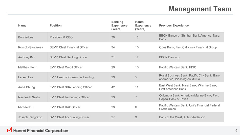 Previous Experience Hanmi Experience (Years) Banking Experience (Years) Position Name BBCN Bancorp, Shinhan Bank America, Nara Bank 12 39 President & CEO Bonnie Lee Opus Bank, First California Financial Group 10 34 SEVP, Chief Financial Officer Romolo Santarosa BBCN Bancorp 12 31 SEVP, Chief Banking Officer Anthony Kim Pacific Western Bank, FDIC 10 29 EVP, Chief Credit Officer Matthew Fuhr Royal Business Bank, Pacific City Bank, Bank of America, Washington Mutual 5 29 EVP, Head of Consumer Lending Larsen Lee East West Bank, Nara Bank, Wilshire Bank, First American Bank 11 42 EVP, Chief SBA Lending Officer Anna Chung Columbia Bank, American Marine Bank, First Capital Bank of Texas 7 23 EVP, Chief Technology Officer Navneeth Naidu Pacific Western Bank, Unify Financial Federal Credit Union 6 26 EVP, Chief Risk Officer Michael Du Bank of the West, Arthur Anderson 3 27 SVP, Chief Accounting Officer Joseph Pangrazio 6 Management Team