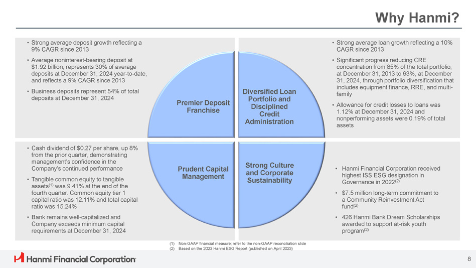 The Hanmi Timeline 1982 - First Korean American Bank in the U.S. 1988 - Began offering SBA loans - Acquired First Global Bank 2001 - Listed HAFC common stock 2004 - Acquired Pacific Union Bank ($1.2 billion in assets) 2007 - Completed $70 million secondary common stock offering 2013 - C.G. Kum appointed as the new CEO - Bonnie Lee appointed as the new COO 2014 - Acquired Central Bancorp, Inc. ($1.3 billion in assets) 2016 - Acquired Commercial Equipment Leasing Division ($228 million in assets) 2017 - Assets surpassed $5 billion - Opened a Manhattan, NY branch 2019 - Bonnie Lee appointed as the new CEO 2022 - Assets surpassed $7 billion - Celebrated 40 th Anniversary - Nasdaq Closing Bell Ceremony For over 40 years, we have been dedicated to helping our stakeholders bank on their dreams . 7 2020 - Launch of USKC (1) - Revitalization of Mortgage Lending (1) U.S. subsidiaries of Korean Corporations 2018 - Opened Chinatown branch in Houston, Texas