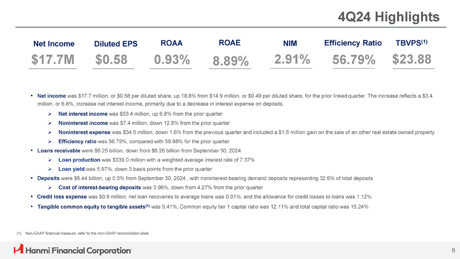 Why Hanmi? • Strong average loan growth reflecting a 10% CAGR since 2013 • Significant progress reducing CRE concentration from 85% of the total portfolio, at December 31, 2013 to 63%, at December 31 , 2024 , through portfolio diversification that includes equipment finance, RRE, and multi - family • Allowance for credit losses to loans was 1.12% at December 31, 2024 and nonperforming assets were 0.19% of total assets • Strong average deposit growth reflecting a 9% CAGR since 2013 • Average noninterest - bearing deposit at $1.92 billion, represents 30% of average deposits at December 31, 2024 year - to - date, and reflects a 9% CAGR since 2013 • Business deposits represent 54% of total deposits at December 31, 2024 Premier Deposit Franchise Diversified Loan Portfolio and Disciplined Credit Administration 8 Strong Culture and Corporate Sustainability Prudent Capital Management • Cash dividend of $0.27 per share, up 8% from the prior quarter, demonstrating management’s confidence in the Company’s continued performance • Tangible common equity to tangible assets (1) was 9.41% at the end of the fourth quarter. Common equity tier 1 capital ratio was 12.11% and total capital ratio was 15.24% • Bank remains well - capitalized and Company exceeds minimum capital requirements at December 31, 2024 • Hanmi Financial Corporation received highest ISS ESG designation in Governance in 2022 (2) • $7.5 million long - term commitment to a Community Reinvestment Act fund (2) • 426 Hanmi Bank Dream Scholarships awarded to support at - risk youth program (2) (1) Non - GAAP financial measure; refer to the non - GAAP reconciliation slide (2) Based on the 2023 Hanmi ESG Report (published on April 2023)