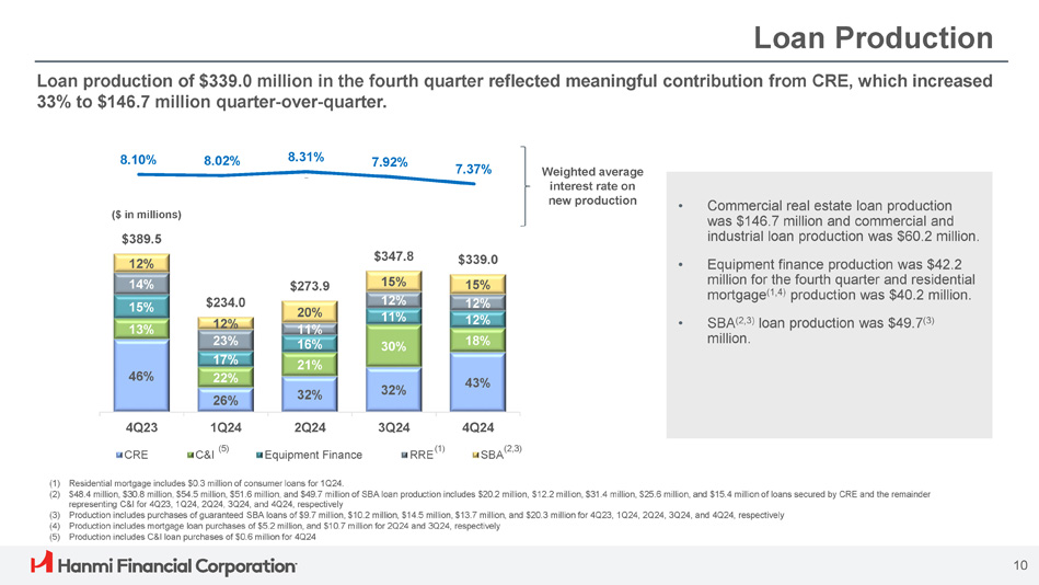 4Q24 Highlights Diluted EPS $0.58 ROAA 0.93% NIM 2.91% Efficiency Ratio 56.79% TBVPS (1) $23.88 Net Income $17.7M • Net income was $17.7 million, or $0.58 per diluted share, up 18.8% from $14.9 million, or $0.49 per diluted share, for the prior linked quarter. The increase reflects a $3.4 million, or 6.8%, increase net interest income, primarily due to a decrease in interest expense on deposits. » Net interest income was $53.4 million, up 6.8% from the prior quarter » Noninterest income was $7.4 million, down 12.8% from the prior quarter » Noninterest expense was $34.5 million, down 1.6% from the previous quarter and included a $1.6 million gain on the sale of an other real estate owned property. » Efficiency ratio was 56.79%, compared with 59.98% for the prior quarter • Loans receivable were $6.25 billion, down from $6.26 billion from September 30, 2024 » Loan produ ction was $339.0 million with a weighted average interest rate of 7.37% » Loan yield was 5.97%, down 3 basis points from the prior quarter • Deposits were $6.44 billion, up 0.5% from September 30, 2024 , with noninterest - bearing demand deposits representing 32.6% of total deposits » Cost of interest - bearing deposits was 3.96%, down from 4.27% from the prior quarter • Credit loss expense was $0.9 million, net loan recoveries to average loans was 0.01%, and the allowance for credit losses to loans was 1.12%. • Tangible common equity to tangible assets (1) was 9.41%, Common equity tier 1 capital ratio was 12.11% and total capital ratio was 15.24% ROAE 8.89% (1) Non - GAAP financial measure; refer to the non - GAAP reconciliation slide 9