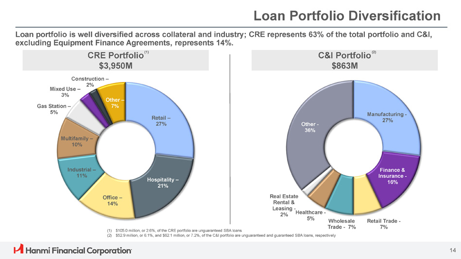 Successful Portfolio Diversification Strategy 12 Loan Composition (as of December 31, 2024) Loan Composition (as of December 31, 2013) $2.23 Billion $6.25 Billion (1) RRE includes Consumer loans (2) $144.5 million or 7.6% and $105.0 million or 2.6% of the CRE portfolio is unguaranteed SBA loans at December 31, 2013 and December 31, 2024, respectively (3) $7.0 million or 3.1% and $52.9 million or 6.1% of the C&I portfolio is unguaranteed SBA loans at December 31, 2013 and December 31, 2024, respectively RRE – 15% Equipment Finance – 8% (1) RRE – 5% Significant progress reducing CRE concentration from 85% of total portfolio to 63%. (1) (2) CRE – 63% C&I (3 – ) 14% (2) CRE – 85% (3) C&I – 10%