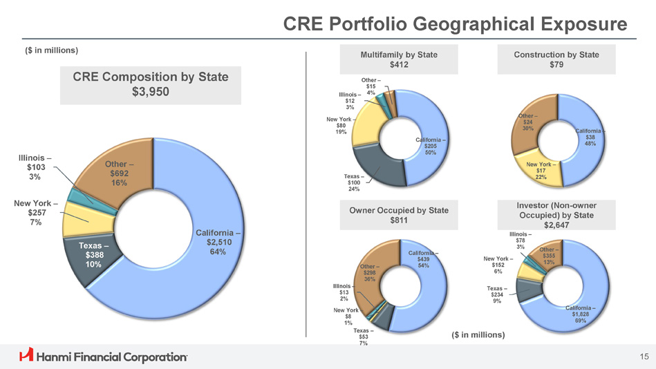 Loan Portfolio Diversification Loan portfolio is well diversified across collateral and industry; CRE represents 63% of the total portfolio and C&I, excluding Equipment Finance Agreements, represents 14%. CRE Portfolio (1) $3,950M C&I Portfolio (2) $863M Retail – 27% Hospitality – 21% Office – 14% Industrial – 11% Multifamily – 10% Gas Station – 5% Mixed Use – 3% Construction – 2% Other – 7% Manufacturing - 27% 14 Finance & Insurance - 16% Retail Trade - 7% Wholesale Trade - 7% Healthcare - 5% Real Estate Rental & Leasing - 2% Other - 36% (1) $105.0 million, or 2.6%, of the CRE portfolio are unguaranteed SBA loans (2) $52.9 million, or 6.1%, and $62.1 million, or 7.2%, of the C&I portfolio are unguaranteed and guaranteed SBA loans, respectively